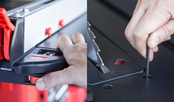 ②テーブルTOPには4か所のブレード平行調整機能が装備しております。4か所のボルトを緩めることでブレードの平行調整を行うことが簡単に可能です。もちろん90度/45度の微調整可能なため、より精度の高い調整が出来ます。
